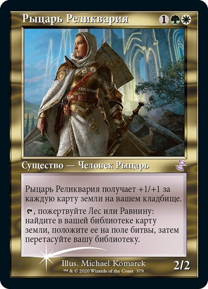 | Rules | Knight of the Reliquary gets +1/+1 for each land card in your graveyard. , Sacrifice a Forest or Plains: Search your library for a land card, put it onto the battlefield, then shuffle. |