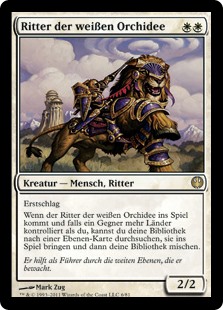 | Rules | First strike When Knight of the White Orchid enters the battlefield, if an opponent controls more lands than you, you may search your library for a Plains card, put it onto the battlefield, then shuffle. |