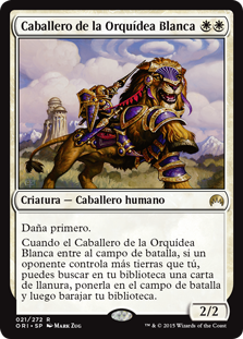 | Rules | First strike When Knight of the White Orchid enters the battlefield, if an opponent controls more lands than you, you may search your library for a Plains card, put it onto the battlefield, then shuffle. |