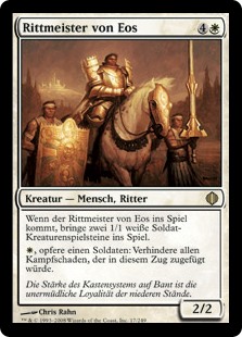 | Rules | When Knight-Captain of Eos enters the battlefield, create two 1/1 white Soldier creature tokens. , Sacrifice a Soldier: Prevent all combat damage that would be dealt this turn. |