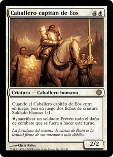 | Rules | When Knight-Captain of Eos enters the battlefield, create two 1/1 white Soldier creature tokens. , Sacrifice a Soldier: Prevent all combat damage that would be dealt this turn. |