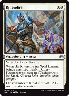 | Rules | Enchant creature When Knightly Valor enters the battlefield, create a 2/2 white Knight creature token with vigilance. (Attacking doesn't cause it to tap.) Enchanted creature gets +2/+2 and has vigilance. |