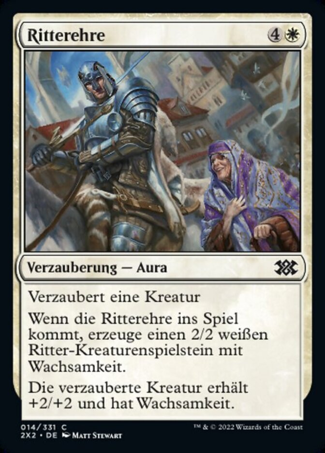 | Rules | Enchant creature When Knightly Valor enters the battlefield, create a 2/2 white Knight creature token with vigilance. (Attacking doesn't cause it to tap.) Enchanted creature gets +2/+2 and has vigilance. |