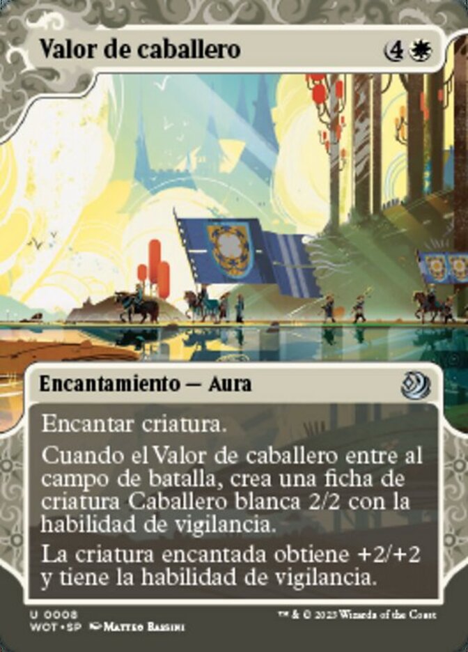 | Rules | Enchant creature When Knightly Valor enters the battlefield, create a 2/2 white Knight creature token with vigilance. (Attacking doesn't cause it to tap.) Enchanted creature gets +2/+2 and has vigilance. |