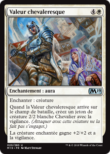 | Rules | Enchant creature When Knightly Valor enters the battlefield, create a 2/2 white Knight creature token with vigilance. (Attacking doesn't cause it to tap.) Enchanted creature gets +2/+2 and has vigilance. |
