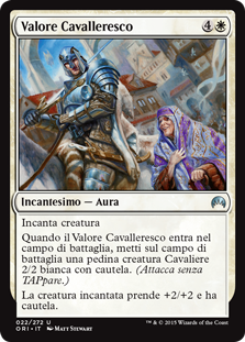 | Rules | Enchant creature When Knightly Valor enters the battlefield, create a 2/2 white Knight creature token with vigilance. (Attacking doesn't cause it to tap.) Enchanted creature gets +2/+2 and has vigilance. |