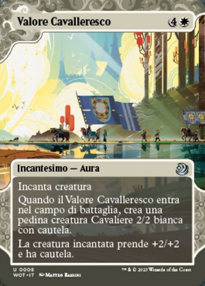 | Rules | Enchant creature When Knightly Valor enters the battlefield, create a 2/2 white Knight creature token with vigilance. (Attacking doesn't cause it to tap.) Enchanted creature gets +2/+2 and has vigilance. |