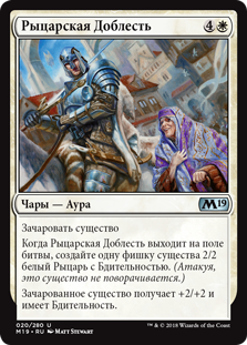 When Knightly Valor enters the battlefield, create a 2/2 white Knight creature token with vigilance. (Attacking doesn't cause it to tap.)