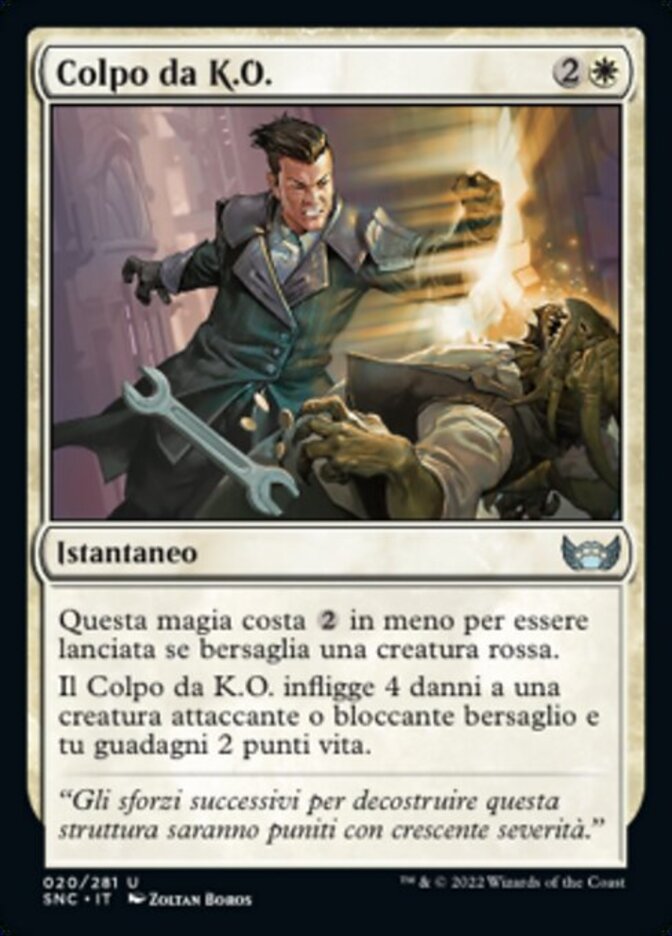 | Rules | This spell costs less to cast if it targets a red creature. Knockout Blow deals 4 damage to target attacking or blocking creature and you gain 2 life. |