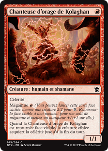 | Rules | Haste Megamorph (You may cast this card face down as a 2/2 creature for . Turn it face up any time for its megamorph cost and put a +1/+1 counter on it.) When Kolaghan Stormsinger is turned face up, target creature gains haste until end of turn. |