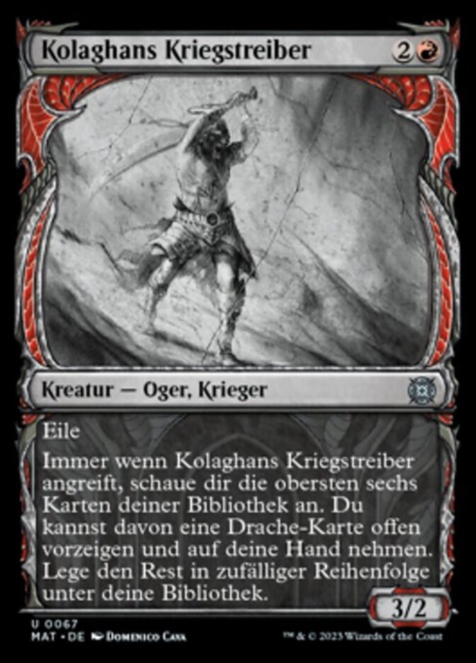| Rules | Haste Whenever Kolaghan Warmonger attacks, look at the top six cards of your library. You may reveal a Dragon card from among them and put it into your hand. Put the rest on the bottom of your library in a random order. |