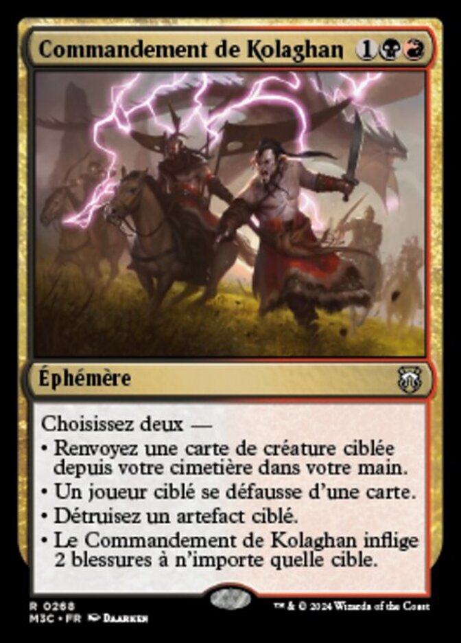 | Rules | Choose two — • Return target creature card from your graveyard to your hand. • Target player discards a card. • Destroy target artifact. • Kolaghan's Command deals 2 damage to any target. |