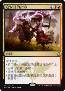 | Rules | Choose two — • Return target creature card from your graveyard to your hand. • Target player discards a card. • Destroy target artifact. • Kolaghan's Command deals 2 damage to any target. |