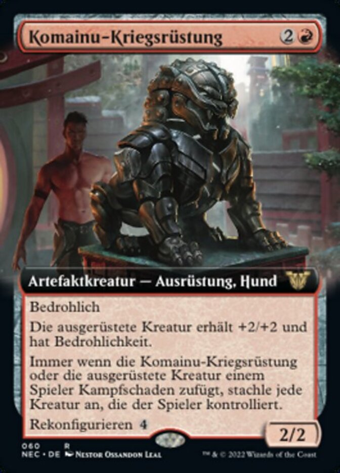 | Rules | Menace Equipped creature gets +2/+2 and has menace. Whenever Komainu Battle Armor or equipped creature deals combat damage to a player, goad each creature that player controls. Reconfigure (: Attach to target creature you control; or unattach from a creature. Reconfigure only as a sorcery. While attached, this isn't a creature.) |