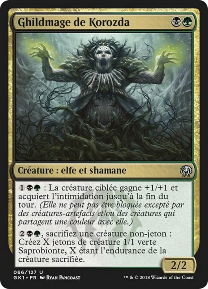 | Rules | : Target creature gets +1/+1 and gains intimidate until end of turn. (It can't be blocked except by artifact creatures and/or creatures that share a color with it.) , Sacrifice a nontoken creature: Create X 1/1 green Saproling creature tokens, where X is the sacrificed creature's toughness. |