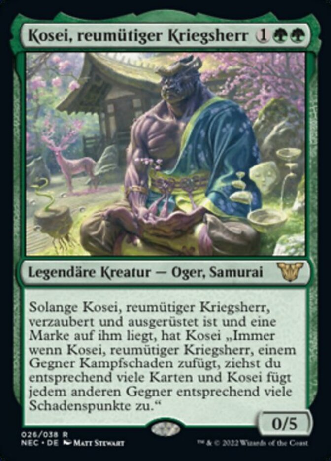 | Rules | As long as Kosei, Penitent Warlord is enchanted, equipped, and has a counter on it, Kosei has "Whenever Kosei, Penitent Warlord deals combat damage to an opponent, you draw that many cards and Kosei deals that much damage to each other opponent." |
