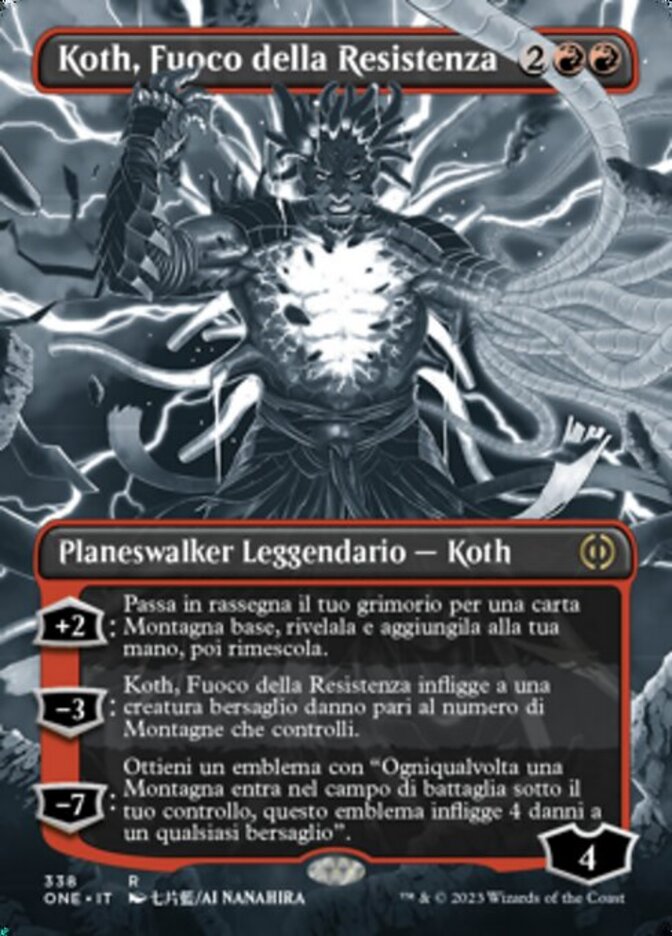 | Rules | +2: Search your library for a basic Mountain card, reveal it, put it into your hand, then shuffle. −3: Koth, Fire of Resistance deals damage to target creature equal to the number of Mountains you control. −7: You get an emblem with "Whenever a Mountain enters the battlefield under your control, this emblem deals 4 damage to any target." |