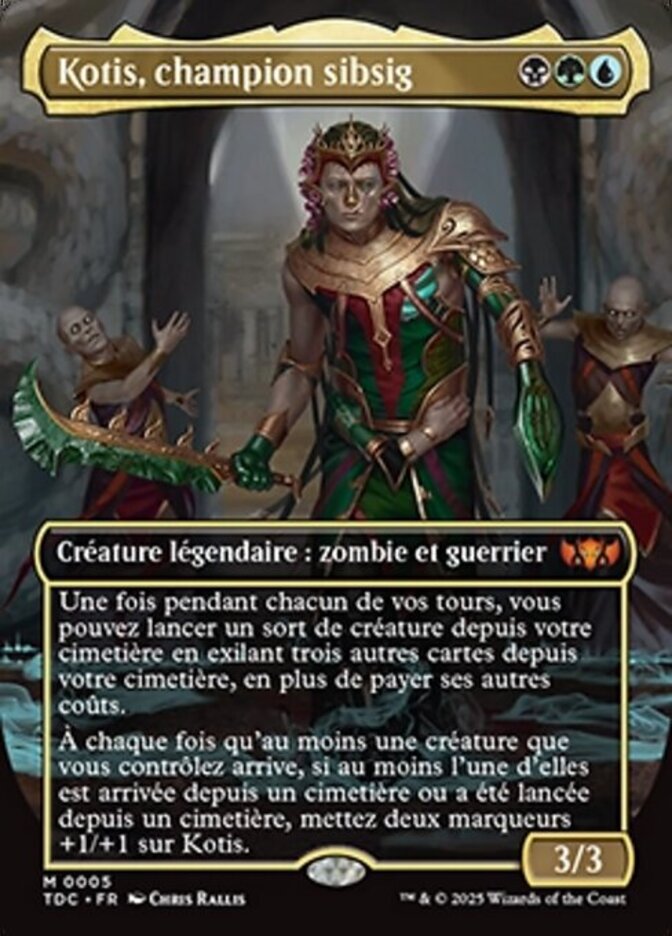 | Rules | Once during each of your turns, you may cast a creature spell from your graveyard by exiling three other cards from your graveyard in addition to paying its other costs. Whenever one or more creatures you control enter, if one or more of them entered from a graveyard or was cast from a graveyard, put two +1/+1 counters on Kotis. |