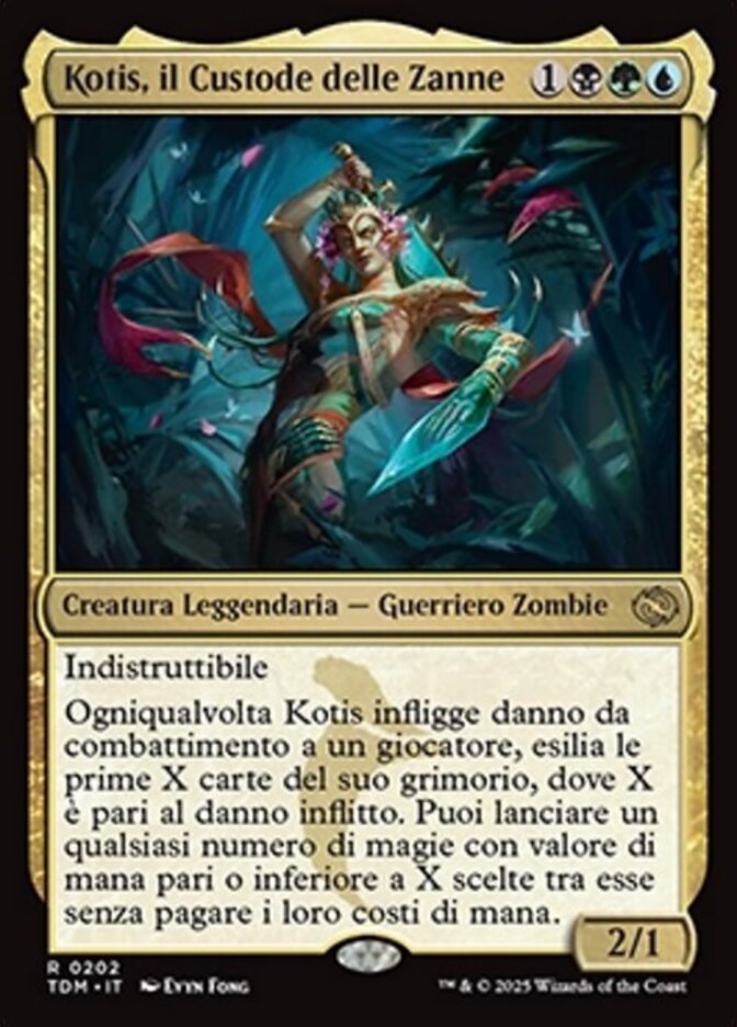 | Rules | Indestructible Whenever Kotis deals combat damage to a player, exile the top X cards of their library, where X is the amount of damage dealt. You may cast any number of spells with mana value X or less from among them without paying their mana costs. |
