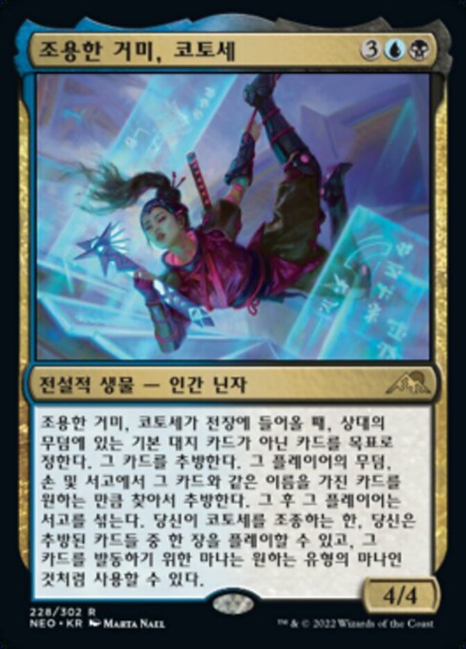 | Rules | When Kotose, the Silent Spider enters the battlefield, exile target card other than a basic land card from an opponent's graveyard. Search that player's graveyard, hand, and library for any number of cards with the same name as that card and exile them. Then that player shuffles. For as long as you control Kotose, you may play one of the exiled cards, and you may spend mana as though it were mana of any color to cast it. |