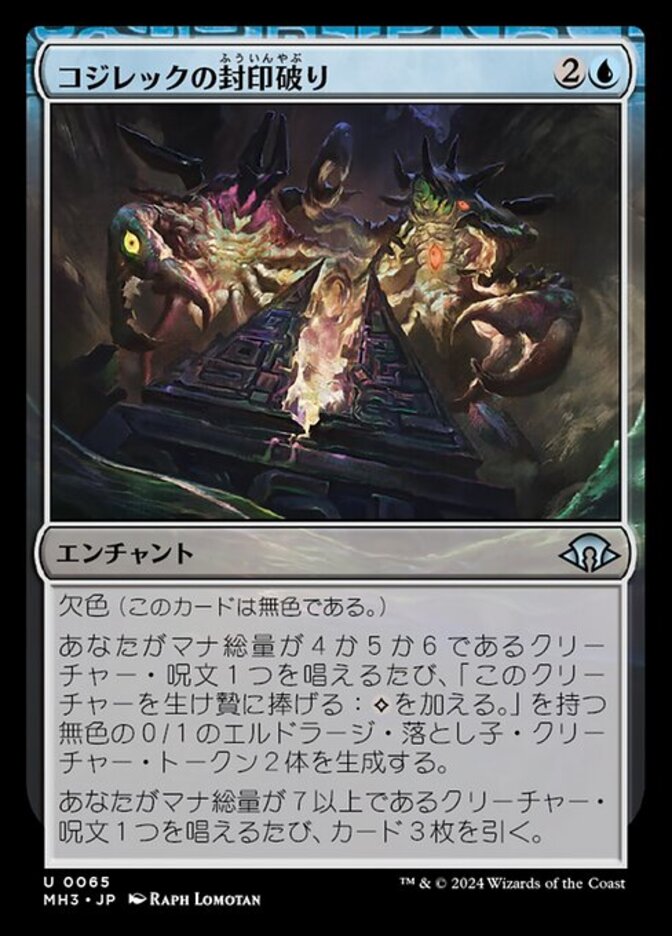 | Rules | Devoid (This card has no color.) Whenever you cast a creature spell with mana value 4, 5, or 6, create two 0/1 colorless Eldrazi Spawn creature tokens with "Sacrifice this creature: Add ." Whenever you cast a creature spell with mana value 7 or greater, draw three cards. |