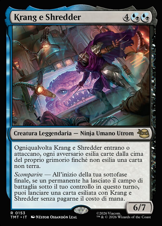 | Rules | Whenever Krang & Shredder enter or attack, each opponent exiles cards from the top of their library until they exile a nonland card. Disappear — At the beginning of your end step, if a permanent left the battlefield under your control this turn, you may cast a card exiled with Krang & Shredder without paying its mana cost. |