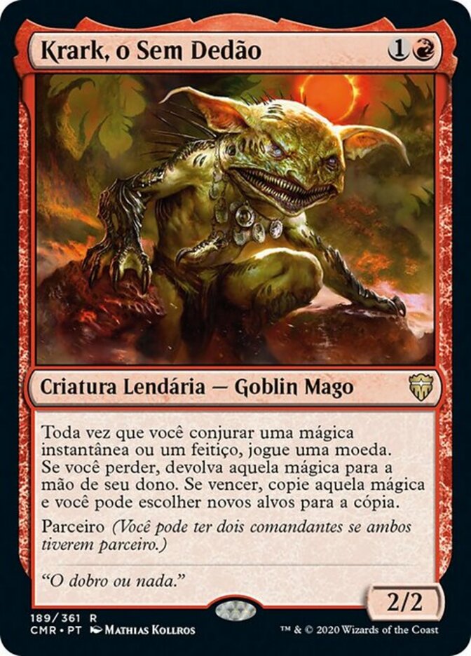 | Rules | Whenever you cast an instant or sorcery spell, flip a coin. If you lose the flip, return that spell to its owner's hand. If you win the flip, copy that spell, and you may choose new targets for the copy. Partner (You can have two commanders if both have partner.) |
