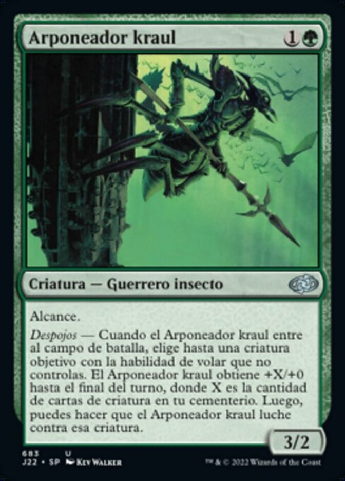 | Rules | Reach Undergrowth — When Kraul Harpooner enters the battlefield, choose up to one target creature with flying you don't control. Kraul Harpooner gets +X/+0 until end of turn, where X is the number of creature cards in your graveyard, then you may have Kraul Harpooner fight that creature. |