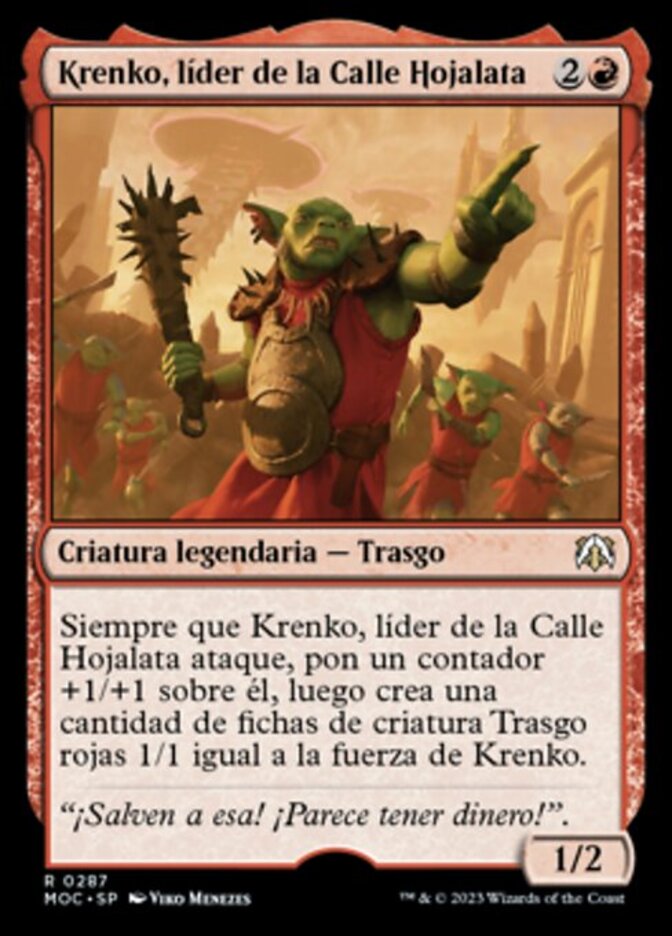 | Rules | Whenever Krenko, Tin Street Kingpin attacks, put a +1/+1 counter on it, then create a number of 1/1 red Goblin creature tokens equal to Krenko's power. |