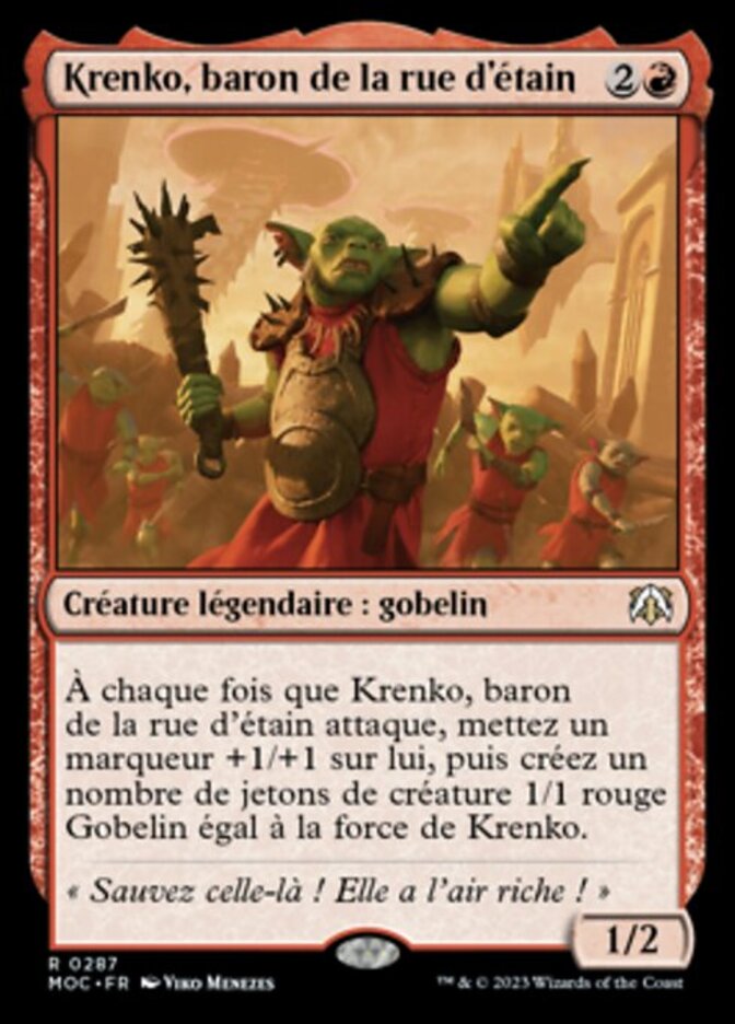 | Rules | Whenever Krenko, Tin Street Kingpin attacks, put a +1/+1 counter on it, then create a number of 1/1 red Goblin creature tokens equal to Krenko's power. |