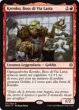 | Rules | Whenever Krenko, Tin Street Kingpin attacks, put a +1/+1 counter on it, then create a number of 1/1 red Goblin creature tokens equal to Krenko's power. |