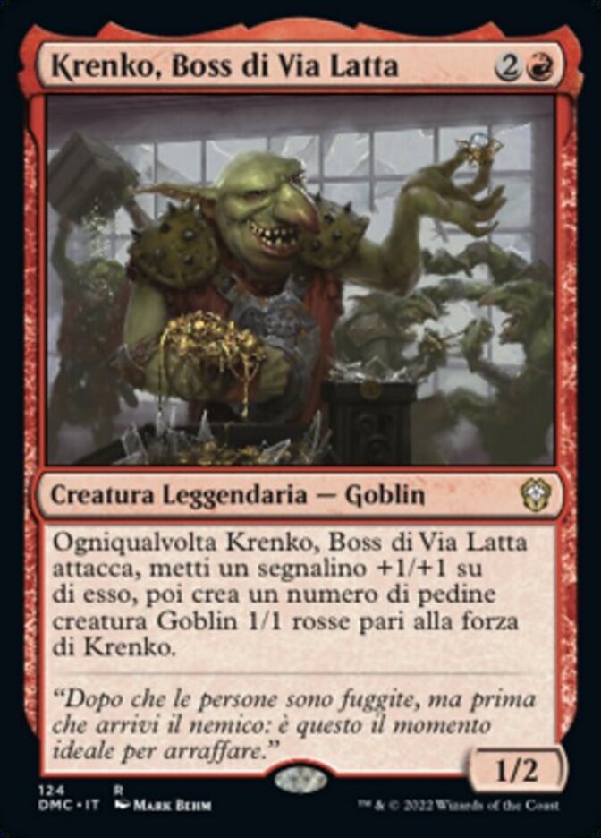 | Rules | Whenever Krenko, Tin Street Kingpin attacks, put a +1/+1 counter on it, then create a number of 1/1 red Goblin creature tokens equal to Krenko's power. |