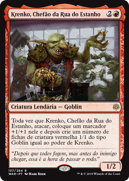| Rules | Whenever Krenko, Tin Street Kingpin attacks, put a +1/+1 counter on it, then create a number of 1/1 red Goblin creature tokens equal to Krenko's power. |