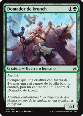 | Rules | Trample Whenever a creature with power 4 or greater enters the battlefield under your control, put a +1/+1 counter on Kronch Wrangler. |