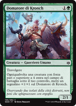 | Rules | Trample Whenever a creature with power 4 or greater enters the battlefield under your control, put a +1/+1 counter on Kronch Wrangler. |