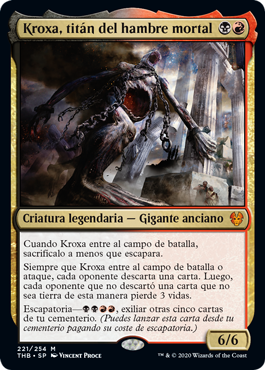 | Rules | When Kroxa enters the battlefield, sacrifice it unless it escaped. Whenever Kroxa enters the battlefield or attacks, each opponent discards a card, then each opponent who didn't discard a nonland card this way loses 3 life. Escape—, Exile five other cards from your graveyard. (You may cast this card from your graveyard for its escape cost.) |