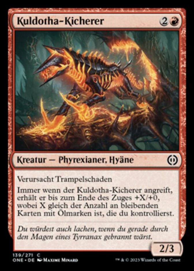 | Rules | Trample Whenever Kuldotha Cackler attacks, it gets +X/+0 until end of turn, where X is the number of permanents you control with oil counters on them. |