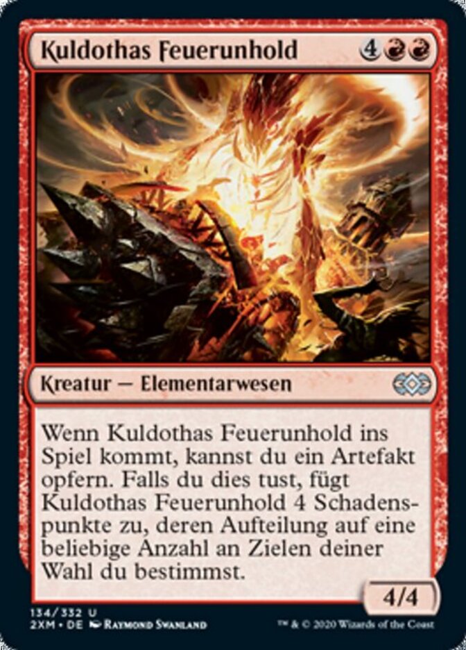 Rules When Kuldotha Flamefiend enters the battlefield, you may sacrifice an artifact. If you do, Kuldotha Flamefiend deals 4 damage divided as you choose among any number of targets.