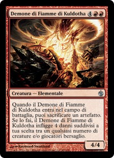 | Rules | When Kuldotha Flamefiend enters the battlefield, you may sacrifice an artifact. If you do, Kuldotha Flamefiend deals 4 damage divided as you choose among any number of targets. |