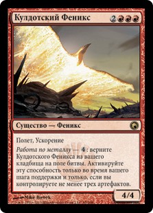 | Rules | Flying, haste Metalcraft — : Return Kuldotha Phoenix from your graveyard to the battlefield. Activate only during your upkeep and only if you control three or more artifacts. |