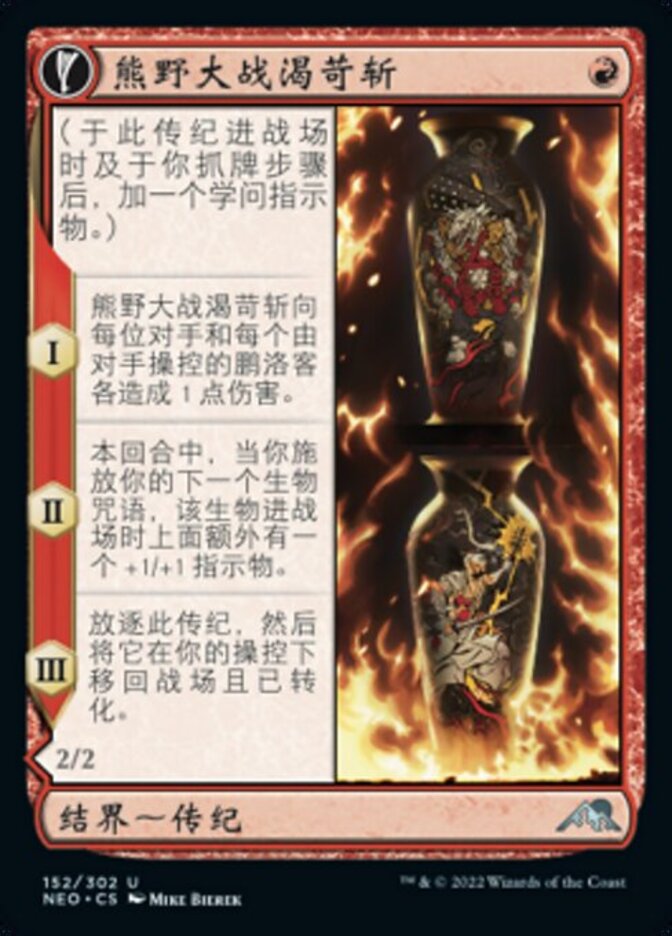 | Rules | (As this Saga enters and after your draw step, add a lore counter.) I — Kumano Faces Kakkazan deals 1 damage to each opponent and each planeswalker they control. II — When you cast your next creature spell this turn, that creature enters the battlefield with an additional +1/+1 counter on it. III — Exile this Saga, then return it to the battlefield transformed under your control. // Haste If a creature dealt damage this turn by a source you controlled would die, exile it instead. |