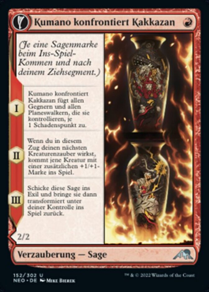 | Rules | (As this Saga enters and after your draw step, add a lore counter.) I — Kumano Faces Kakkazan deals 1 damage to each opponent and each planeswalker they control. II — When you cast your next creature spell this turn, that creature enters the battlefield with an additional +1/+1 counter on it. III — Exile this Saga, then return it to the battlefield transformed under your control. // Haste If a creature dealt damage this turn by a source you controlled would die, exile it instead. |
