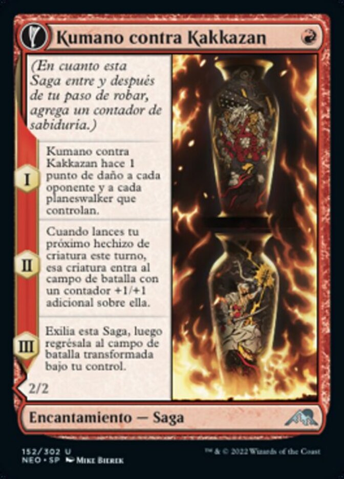 | Rules | (As this Saga enters and after your draw step, add a lore counter.) I — Kumano Faces Kakkazan deals 1 damage to each opponent and each planeswalker they control. II — When you cast your next creature spell this turn, that creature enters the battlefield with an additional +1/+1 counter on it. III — Exile this Saga, then return it to the battlefield transformed under your control. // Haste If a creature dealt damage this turn by a source you controlled would die, exile it instead. |