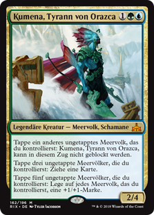 | Rules | Tap another untapped Merfolk you control: Kumena, Tyrant of Orazca can't be blocked this turn. Tap three untapped Merfolk you control: Draw a card. Tap five untapped Merfolk you control: Put a +1/+1 counter on each Merfolk you control. |