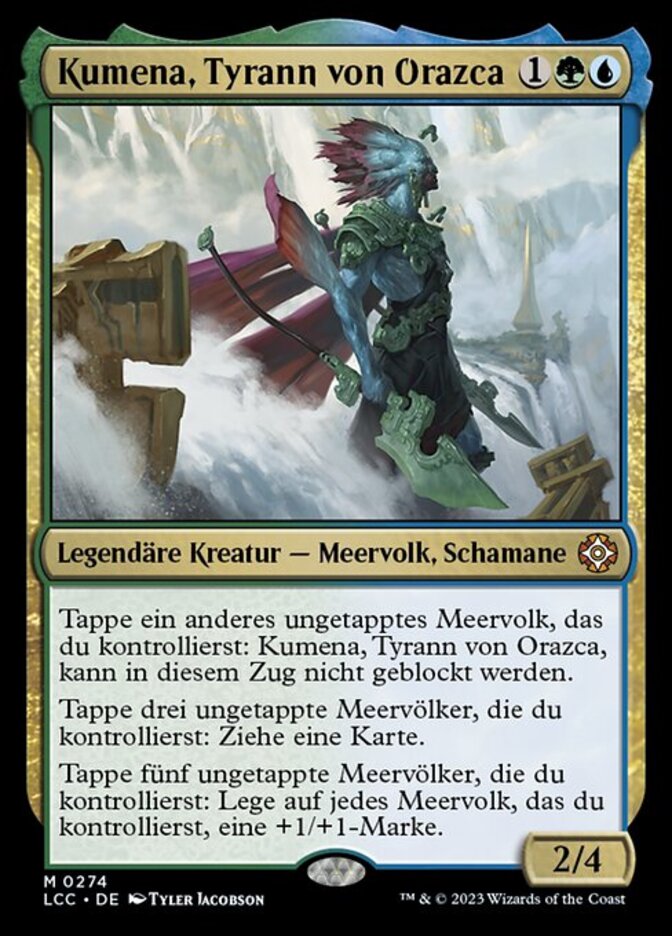 | Rules | Tap another untapped Merfolk you control: Kumena, Tyrant of Orazca can't be blocked this turn. Tap three untapped Merfolk you control: Draw a card. Tap five untapped Merfolk you control: Put a +1/+1 counter on each Merfolk you control. |