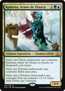 | Rules | Tap another untapped Merfolk you control: Kumena, Tyrant of Orazca can't be blocked this turn. Tap three untapped Merfolk you control: Draw a card. Tap five untapped Merfolk you control: Put a +1/+1 counter on each Merfolk you control. |