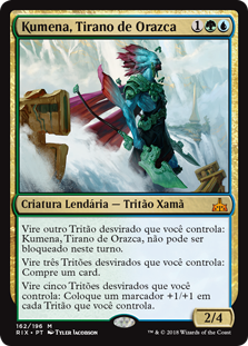 | Rules | Tap another untapped Merfolk you control: Kumena, Tyrant of Orazca can't be blocked this turn. Tap three untapped Merfolk you control: Draw a card. Tap five untapped Merfolk you control: Put a +1/+1 counter on each Merfolk you control. |