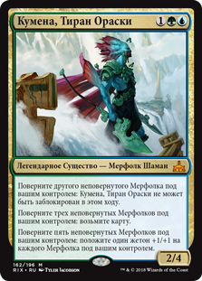 | Rules | Tap another untapped Merfolk you control: Kumena, Tyrant of Orazca can't be blocked this turn. Tap three untapped Merfolk you control: Draw a card. Tap five untapped Merfolk you control: Put a +1/+1 counter on each Merfolk you control. |