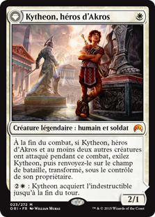 | Rules | At end of combat, if Kytheon, Hero of Akros and at least two other creatures attacked this combat, exile Kytheon, then return him to the battlefield transformed under his owner's control. : Kytheon gains indestructible until end of turn. // +2: Up to one target creature an opponent controls attacks Gideon, Battle-Forged during its controller's next turn if able. +1: Until your next turn, target creature gains indestructible. Untap that creature. 0: Until end of turn, Gideon, Battle-Forged becomes a 4/4 Human Soldier creature with indestructible that's still a planeswalker. Prevent all damage that would be dealt to him this turn. |
