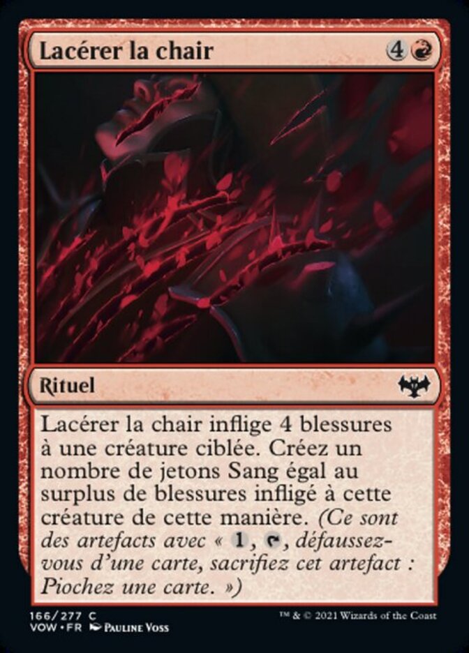 | Rules | Lacerate Flesh deals 4 damage to target creature. Create a number of Blood tokens equal to the amount of excess damage dealt to that creature this way. (They're artifacts with ", , Discard a card, Sacrifice this artifact: Draw a card.") |